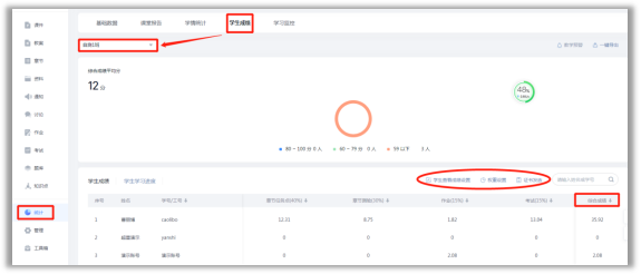 学生成绩是按照老师设定的成绩权重统计的学生综合成绩。在统计界面可以看到该班级的综合成绩平均分,学生分数段的分布情况。