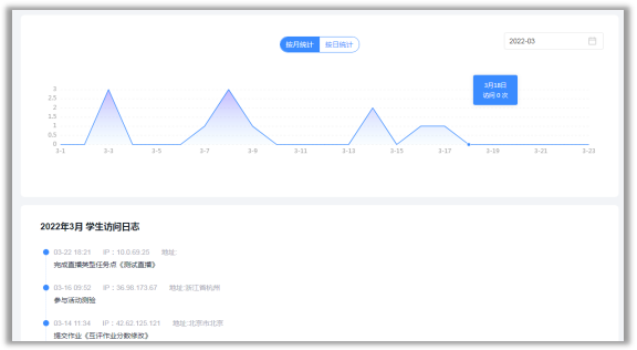③点击访问日志的查看,可以查看学生的访问记录及学生完成任务点的时间及IP。