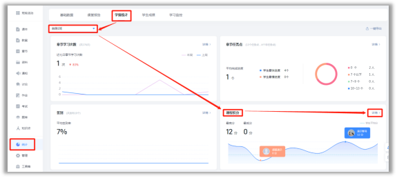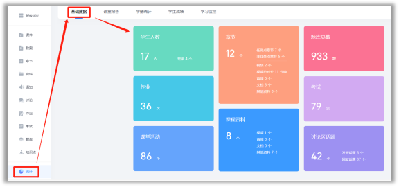 课程统计可以展示基础数据、课堂报告、学情统计、学生成绩和学习监考五大版块内容。
