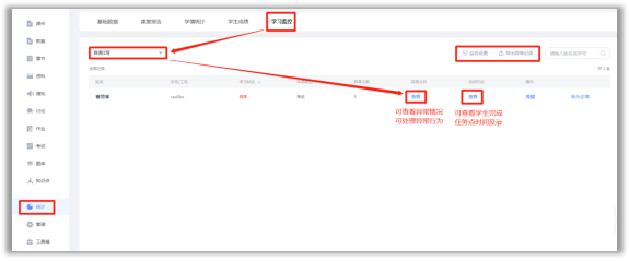 如果老师开启了学生端学习监控,系统就会统计学生访问及完成任务点的数据,发现异常会显示在学习监控里。