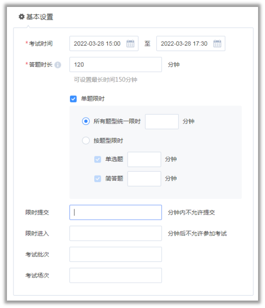 设置考试时间:设置考试开始、截止时间、答题时长(必须设置);题目限时、限时提交、限时进入、考试批次场次(选择设置)等信息。