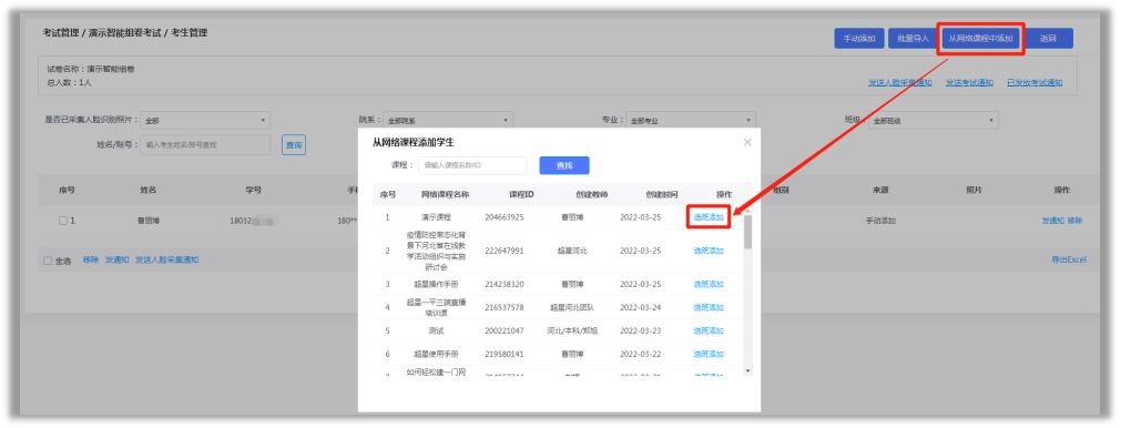③从网络课程中添加:点击右上角【从网络课程中添加】,可选择课程下的班级进行批量添加。
