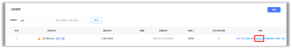 ①点击试卷后面的发布考试,进入发布考试设置界面。