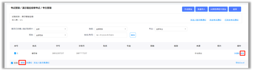 可以添加、导入、移除考生,给学生发放人脸采集通知、发放考试通知。