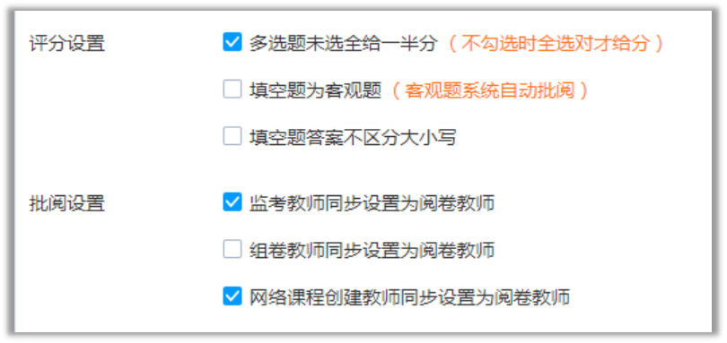 其他高级设置:对考试及格标准、重做、分值、其他防作弊,评分、批阅等详细设置。
