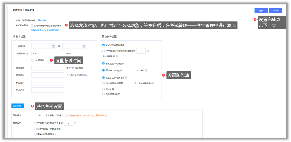 ②设置考试对象、考试时间、防作弊设置、其他高级设置,设置完成后,点击下一步。