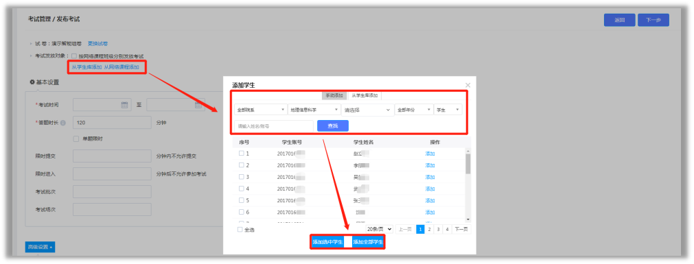 设置发放对象:可以从学生库选择,也可以从网络课程班级下选择学生。也可以跳过本项设置,等发布后在考试管理——考生管理中添加考生。