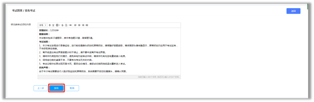 ③设置完成后,点击右上角下一步,修改考试须知,点击发布,试卷发布成功。