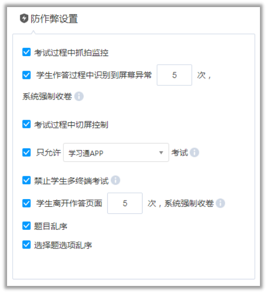 设置防作弊:设置考试过程中抓拍、切屏、考试端口等设置。只有设置了防作弊,才有监考数据,否则无法监考。