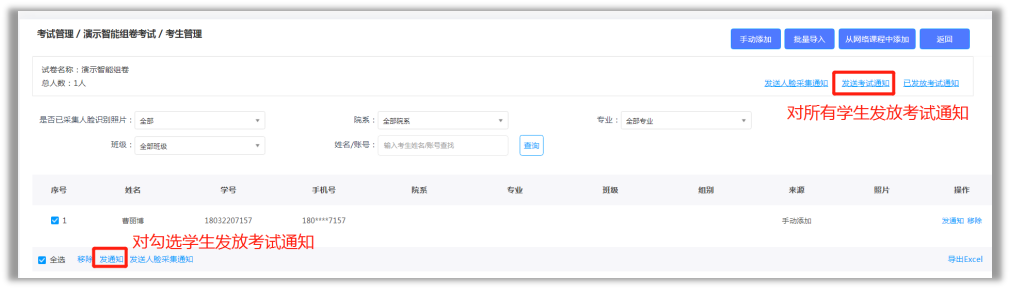 点击右上角【发送考试通知】,可以给全部考生发布考试通知。学生可以通过通知进入考试。也可以勾选个别学生,对勾选学生发布考试通知。