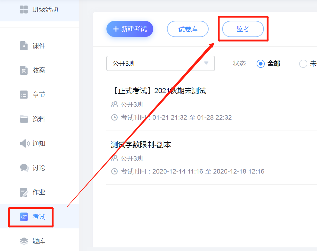 1.进入课程后,在左侧导航栏找到【考试】——【监考】,点击进入。