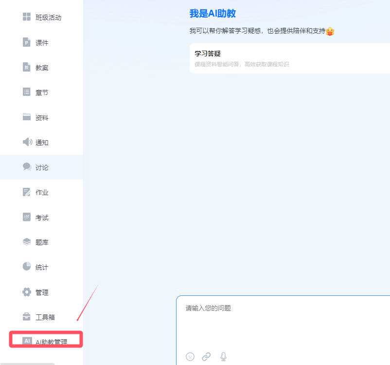 进入课程新版界面 左侧导航栏最下方找【AI助教管理后台】,进入即可设置。