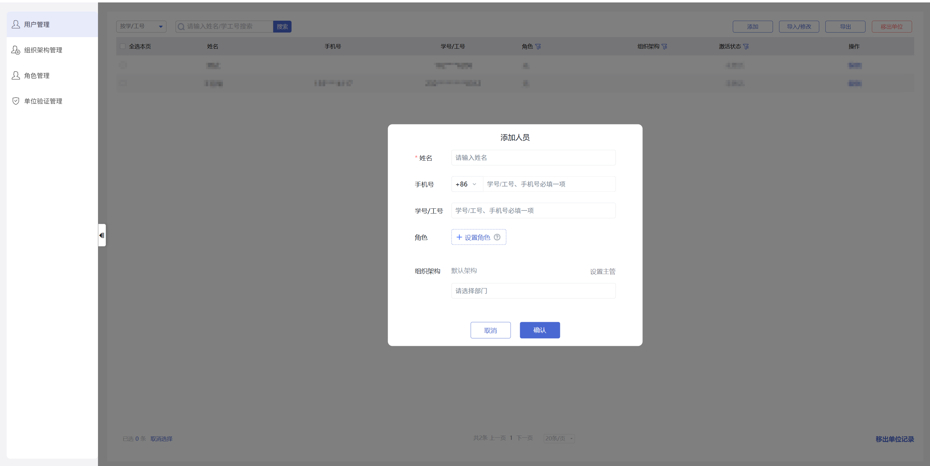 在用户管理中,通过填写用户的姓名 与 学工号/手机号 直接添加。