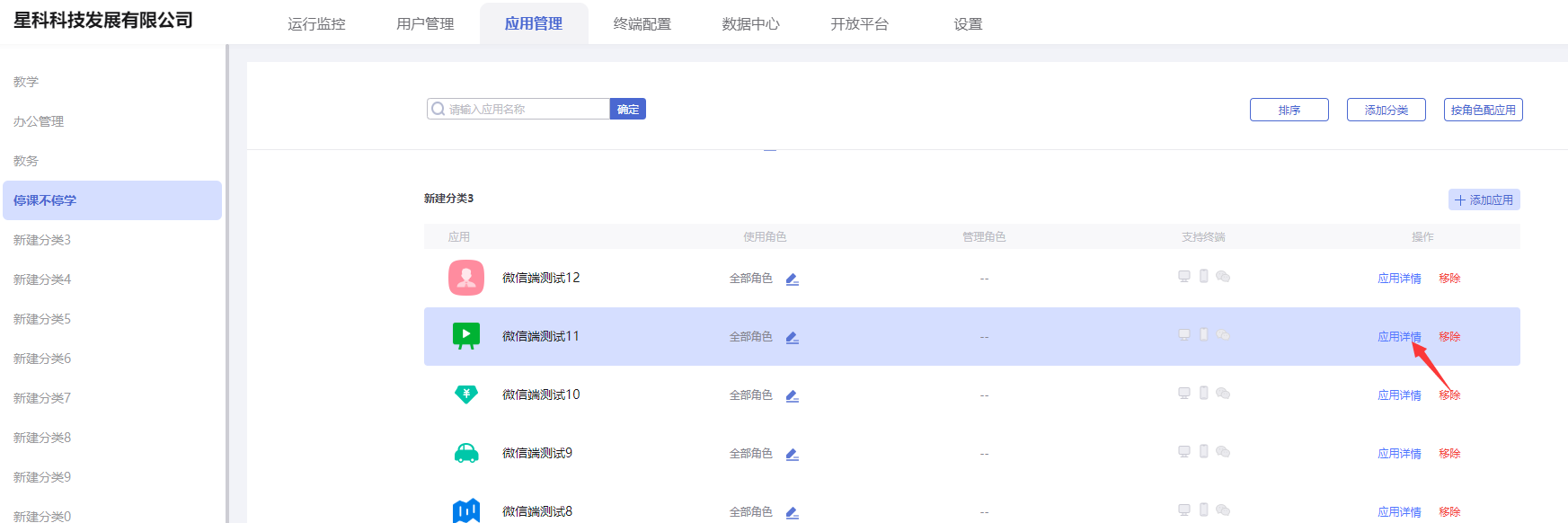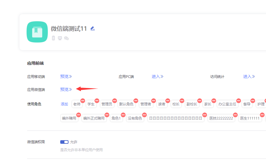 PS:在应用详情页——微信端权限里可以设置该应用在微信端是否允许非本单位用户使用。