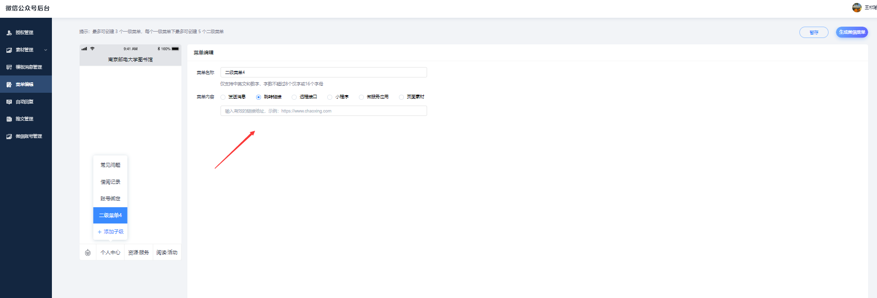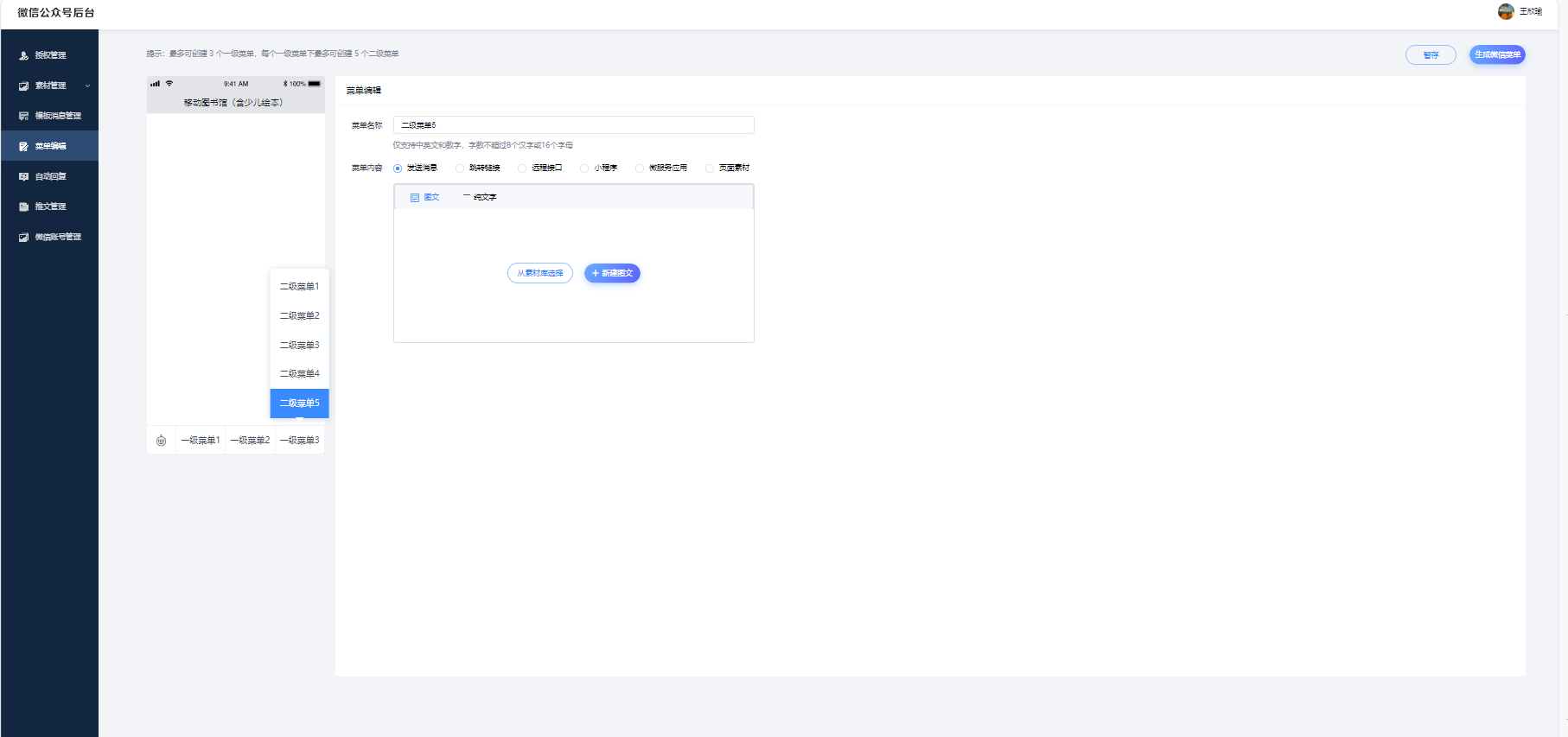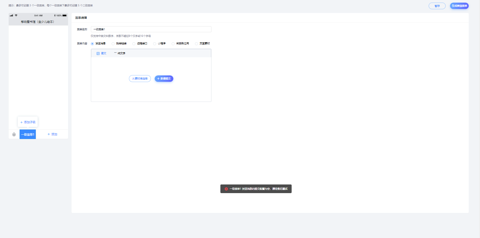 注意:菜单内容-发送消息不能为空,否则点击生成微信菜单会报错提示