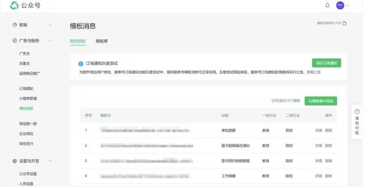 申请开通后,微信公众平台左侧导航一广告与服务一找到“模板消息”模块,点击【从模板库中添加】