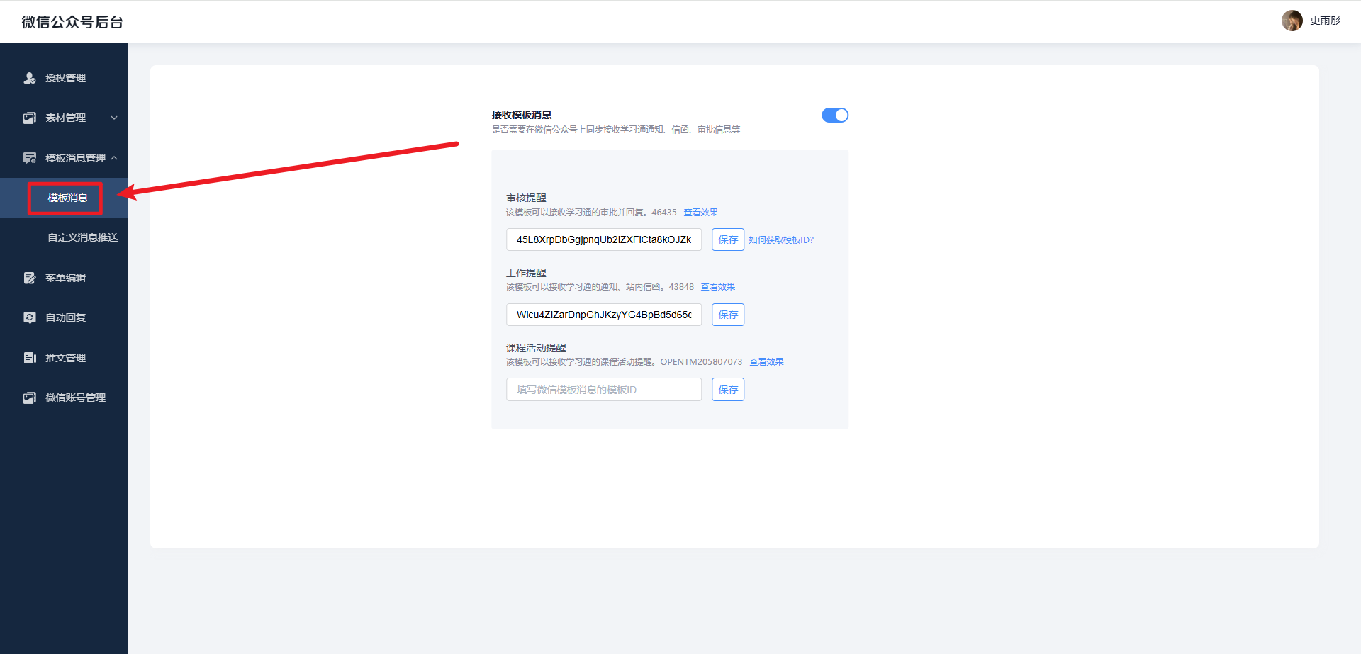 将申请成功的模板id分别填入到微服务-微信公众号-模板消息管理