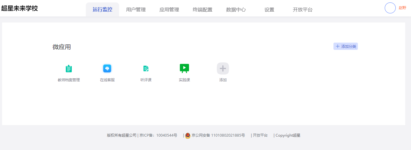 通过v1.chaoxing.com或者各个事业部的微服务域名登录,系统根据登录用户的权限,自动显示“首页”导航,点击“添加”按钮可以添加本人有权限使用的应用(包括前台、后台)。