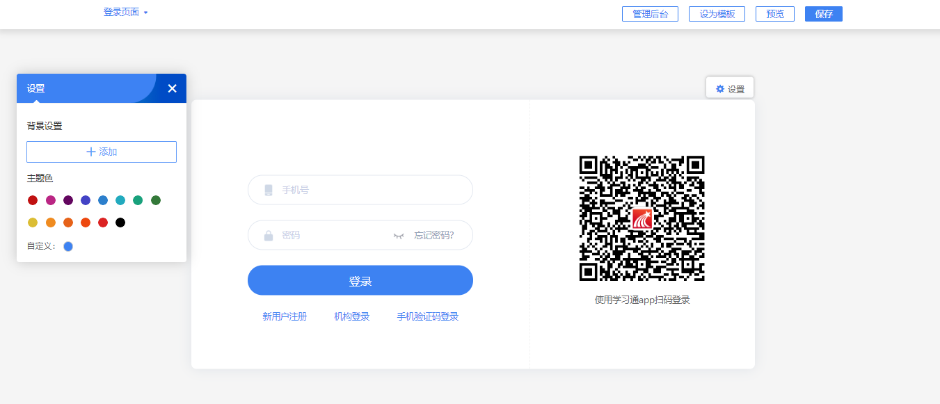 step1:修改登录页的背景、主题色。配置完毕后,点击“保存”。
