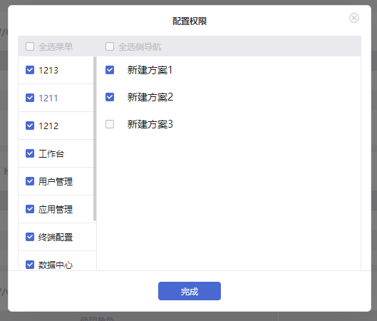 点击配置权限,弹窗里显示该模板的顶部菜单和左侧菜单,通过勾选操作,可以指定该角色能使用哪些菜单。