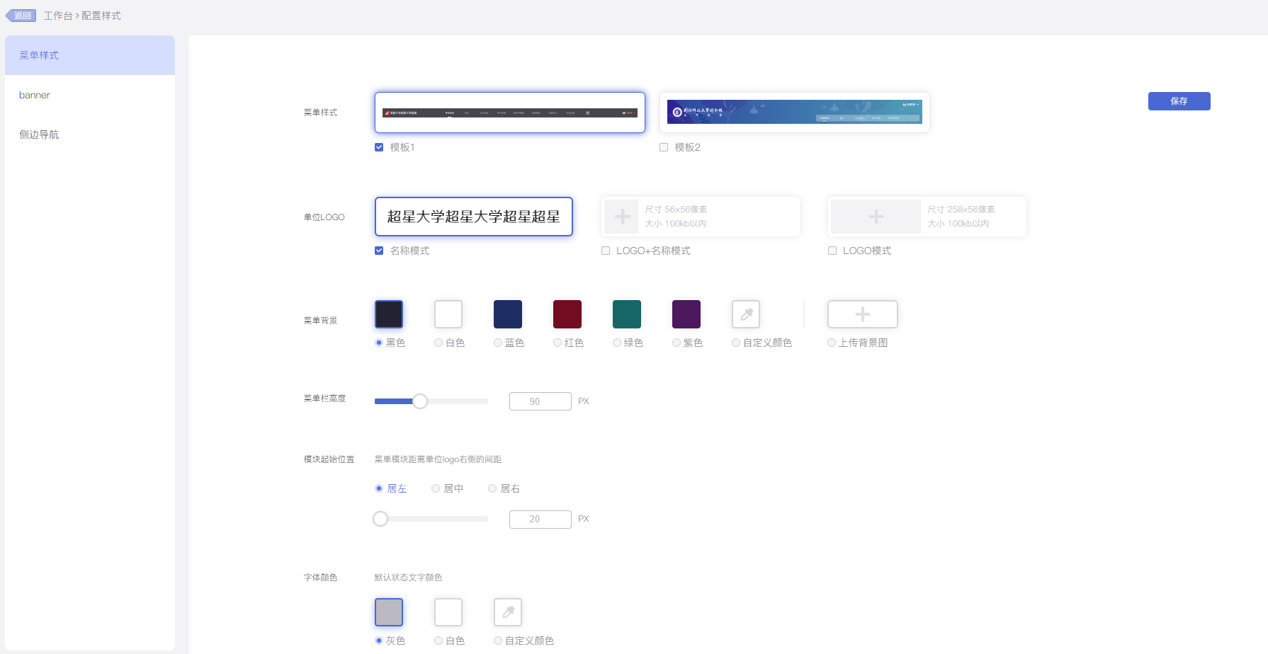 对当前业务系统样式进行自定义配置,包括顶部菜单、banner以及侧边栏三个部分的配置。配置完成后点击“保存”返回上一页