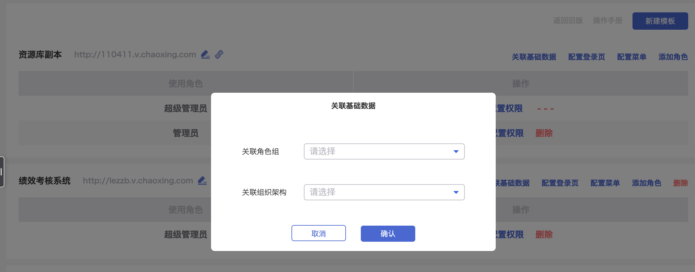 --添加角色:点击添加角色,为模板指定使用者。用户如果在单位里是对应角色,就可以通过访问自定义域名访问该后台。(第一个模板也可以通过v?.chaoxing.com)访问。