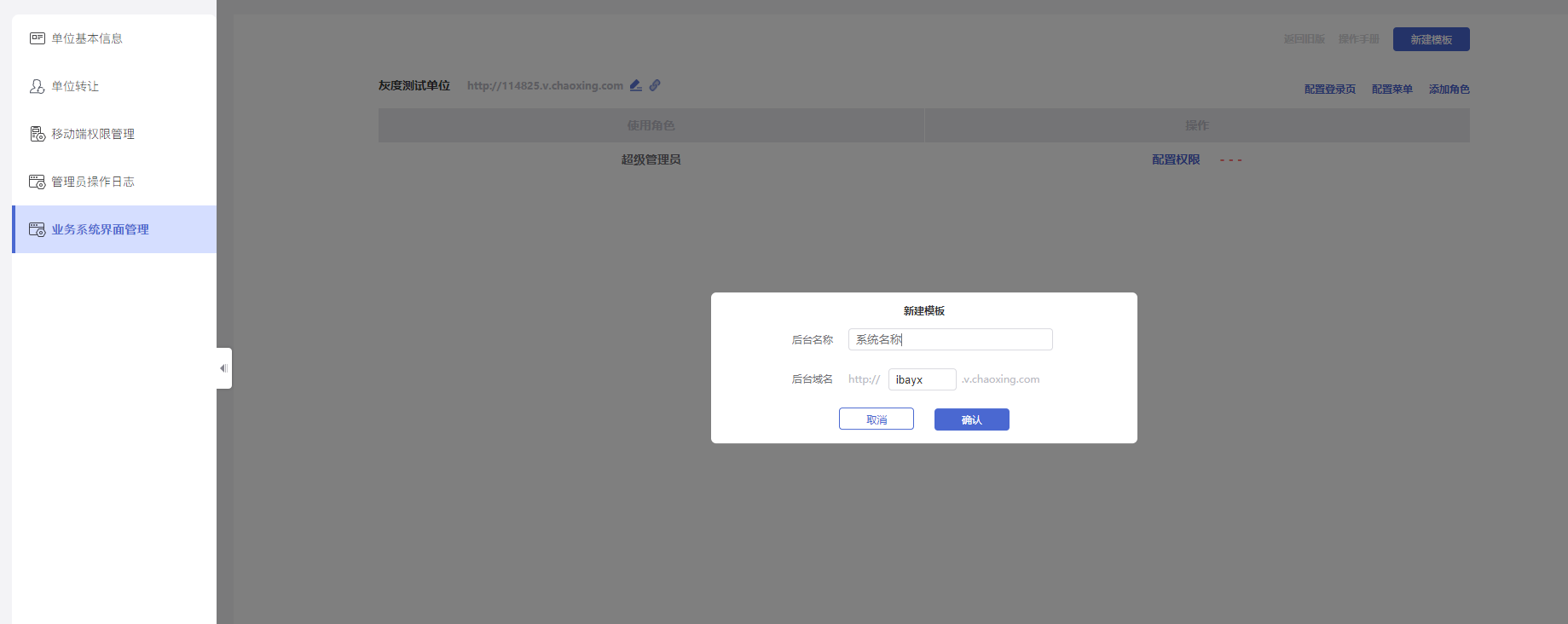 通过“设置——业务系统界面管理”进入。初次进入设置时,系统会自动添加默认模板(模板名为单位名)和超级管理员角色。通过“新建模板”可以添加新模板;通过“添加角色”可以为模板添加使用角色。