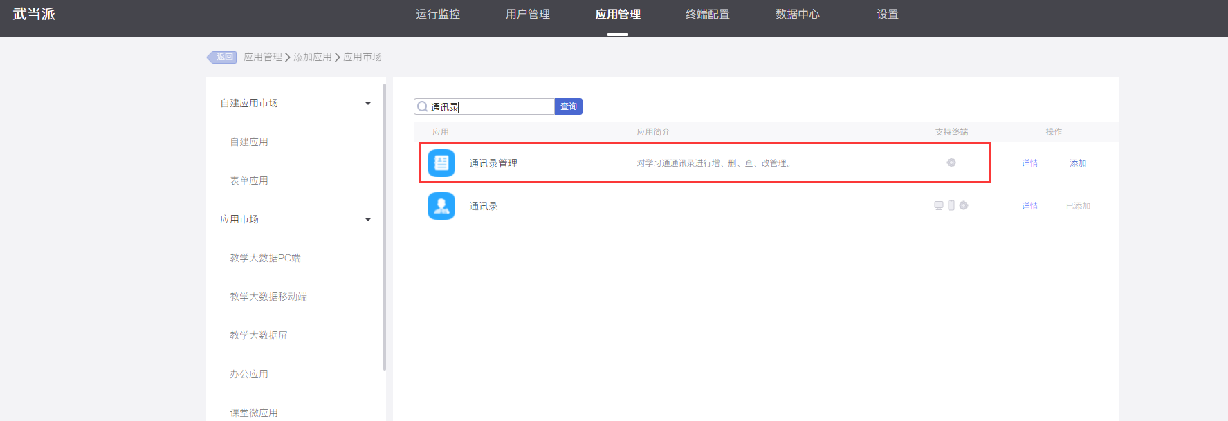 从应用市场添加,搜索通讯录管理,添加该应用后对单位通讯录进行管理,通讯录即学习通通讯录,只有添加进通讯录的用户才能看到本单位通讯录。