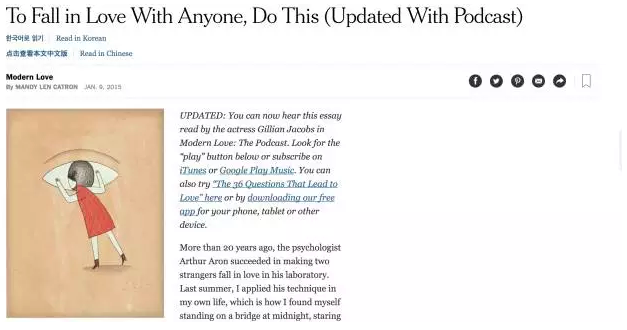 实际上真正让这个36个问题的实验在网上火起来,正是得力于一位名叫Mandy Len Catron的作家2015年在《纽约时报》上用文字和播客的形式分享了她因为这个实验而和一位陌生人相爱的故事(播客的链接和中文文字版在我们微博Owl_in_Owl可以找到 )。