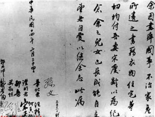 宋庆龄嫁给孙中山后度过了十年动荡不安的时光,孙中山过早因病逝世,但是他也没有给宋庆龄留下财产。1925年3月12日孙中山在北京逝世前给宋庆龄的遗嘱是:“余因尽瘁国事,不治家产。其所遗之书籍、衣物、住宅等,一切均付吾妻宋庆龄,以为纪念。余之儿女已长成,能自立,望各自爱,以继余志。”