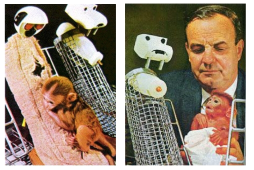 研究的设计其实非常简单,哈罗和同事设计了两个“母亲”,就是能够为小猴子们提供奶水、温度(由暖灯产生)等的“代理母猴”,“她们”所不同的是,一个是木制的,身上有柔软的毛绒织布,而另一个“代理母猴”则是由铁丝网制成的。除此之外,两只“母猴”没有区别。