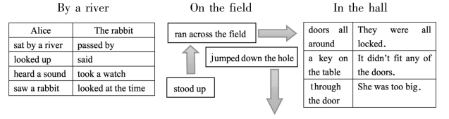 T:Did you find the answers?Hands up!At first,Alice stood up,ran across the field after the rabbit and then jumped down the rabbit hole(板书).