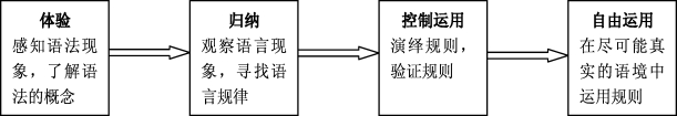 语法教学可以分为体验、归纳、控制性练习和自由运用四个教学环节。体验活动主要是感知语法现象的形式和意义,为归纳语法规则而进行准备。语法的体验可以通过听和读来完成。简单的语法现象,多通过听来感知和体验,在低年级的语法教学中尤其如此。而复杂一些的语法现象,如定语从句等,则多通过阅读来感知和体验。归纳语法规则的活动通常发生在听或读的活动之后,学生通过仔细观察相关的大量语法现象来归纳其中的规则。掌握了规则的用法,学生再通过控制性的练习来验证和运用规则。自由活动是语言的产出活动,注意力完全集中在要表达的内容上面。其过程如下图所示: