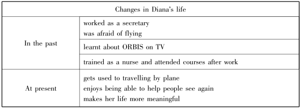 T:Diana is a nurse from ORBIS.Let's look at some pictures about the changes in Diana's life.