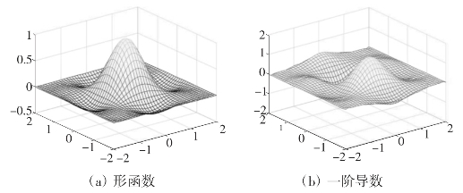 图2.4 给出了RPIM 形函数及其x 方向偏导数图。从RPIM近似函数的推导和图2.4 可以看出,RPIM 形函数有如下特点: