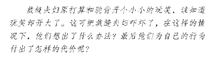 “喂,现在该怎么办呀?”老婆焦急地望着裁缝,“快想个办法,现在我们可是热锅上的蚂蚁了。”