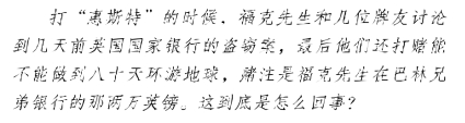 他们现在谈的这件事情正是最近各报刊的头版头条。3天前,英国国家银行丢失了一笔5.5万镑的巨款。这起盗窃案并不像你们想象中的抢劫银行那么惊险,相反地,丢失得太容易了。