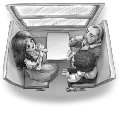 艾娥达夫人坐在车厢的一个舒服的座位上,她慢慢地清醒过来,“昂格”酒的麻醉作用已经消失了。当她发现自己坐在火车上,穿着欧式服装和这些素不相识的旅客在一起的时候,她惊讶极了,连连问道:“这到底是怎么回事?我没有死吗?你们是谁?我这是在哪儿?”