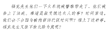 火车到站了。福克先生他们早早下车,为的是赶上中午开往香港的邮船,好找到一个舒服的房舱给艾娥达夫人。他们刚要走出车站,一个警察走过来对福克先生说:“您是斐利亚·福克先生吗?”