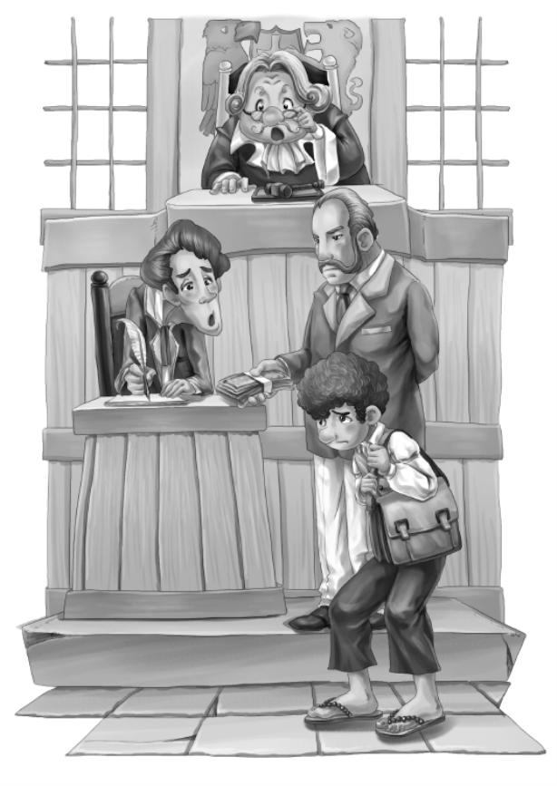 审判官欧巴第亚出庭了,他后面跟着一个书记官。这位法官是个大胖子,胖得像个大皮球。他把挂在钉子上的假发取下来,熟练地往头上一扣,同时宣布:“开始第一个案件。”但是这时他用手摸了一下自己的胖脑袋说:“咦!这假发不是我的!”“欧巴第亚先生,”书记官说,“那是我的。”“啊,亲爱的奥依斯特布夫先生,您叫一位法官戴上书记官的假发,那怎么能办好案子!”于是他们换了假发。