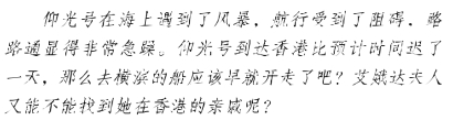 在这一次航行的最后几天里,天气相当坏。风愈来愈大,一直在刮西北风,阻扰着仰光号的前进。船身很不稳定,颠簸得非常厉害,旅客们都怨声载道。如果风暴不止的话,到达香港的时间就会比规定时间延迟20小时以上,80天环游地球的计划会不会就这样打破了呢?