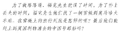 但是,上帝似乎不帮福克先生的忙。尽管他们把时间抓得紧紧的,但还是没有赶上开往利物浦去的中国号,45分钟之前它就出发了!接下来该怎么办呢?难道真的要输掉这场赌局了吗?