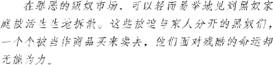 拍卖商说着,把孩子用力往台子上一推,这时,台下传来一阵哀痛的哭声。阿尔伯特停下脚步,不舍地望着母亲,可是他又无能为力,只好擦干眼泪,站在台上。他身材修长,动作敏捷,充满活力的样子立即引起了竞争,五六个人同时在喊价。阿尔伯特听到此起彼伏的叫价声,焦急而惊恐地望着四周,直到木槌落下。最后,是海利买下了他。就这样,阿尔伯特跟他可怜的母亲被拆散了,他被带到新主人面前,不住地回头张望母亲,海加尔大婶面容憔悴,浑身发抖,双手也哆哆嗦嗦地伸向儿子。