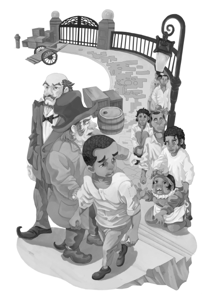 “别担心,海加尔大婶,”一个年长的男黑奴安慰道,“我跟汤麦斯老爷说过了,他说会尽量想办法把你们母子俩一起卖出去。”