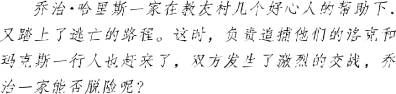 此时,追捕的人也已经赶到这儿,他们正从下往上张望着。在黎明的曙光下,乔治把山下那伙人看得一清二楚,他们是洛克、玛克斯、两个警察,还有一帮打手。