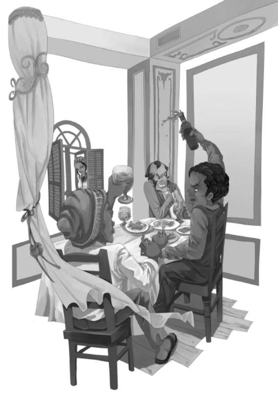 “我还是去把山宝和昆宝找来,叫他们陪我喝酒吧!”于是他吹了个口哨,招呼那两个黑奴过来,并命令他们唱歌、跳舞,希望能借这些娱乐来摆脱内心的恐惧。