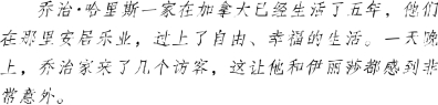 一天晚上,在蒙特利尔城郊一套整洁的小公寓里,乔治正在看一本书。“过来,乔治,”伊丽莎喊道,“你今天一整天都不在家,把书搁下吧,趁我沏茶的时候,咱们聊聊天吧。”“好的,夫人!”乔治微笑着应允道。