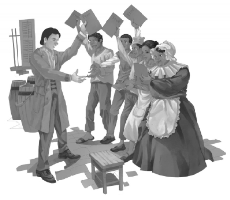 一个月后的一天早晨,谢尔贝家全体仆人被召集在汤姆叔叔的小屋里,听乔治少爷讲话。小主人走进来,手里捧着一堆文书。乔治少爷一个一个地念着仆人们的名字,并将自由证书发给他们。所有人都感到非常惊喜,并激动地流下泪来。仆人们不约而同地跪了下来,唱起一首感恩的赞美诗。
