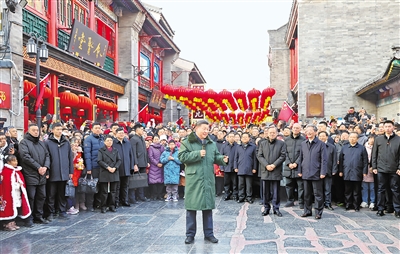 当天下午,习近平来到天津古文化街。街道古色古香,习近平沿街步行,先后走进桂发祥十八街麻花、果仁张、泥人张、杨柳青年画等特色店铺,了解产品种类、销售和传统文化传承发展等情况,同店铺业主、员工和现场群众互动交流。他说,各级党委和政府要加强节日期间民生商品的产销保供,确保数量充足、品类丰富、质量可靠,让广大群众放心消费、快乐过年。习近平指出,中国式现代化离不开优秀传统文化的继承和弘扬,天津是一座很有特色和韵味的城市,要保护和利用好历史文化街区,使其在现代化大都市建设中绽放异彩。