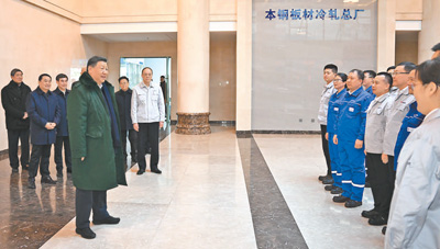 23日下午,习近平在本溪市考察本钢板材冷轧总厂第三冷轧厂时,亲切看望劳动模范、青年技术骨干、一线职工代表。新华社记者 谢环驰摄